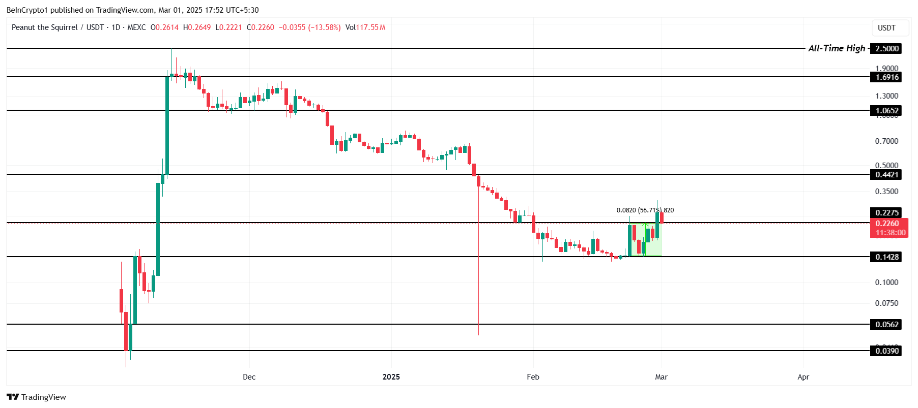 Een andere van de top meme coins, PNUT, heeft de verwachtingen overtroffen met een rally van 56% deze week, waarmee $0,226 werd bereikt en de verliezen van februari werden gewist. De altcoin richt zich nu op het veiligstellen van $0,227 als een stabiel steunniveau. Het handhaven van dit niveau zal cruciaal zijn voor aanhoudend opwaarts momentum en prijsstabiliteit op korte termijn.