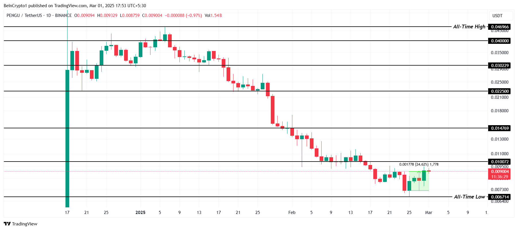 PENGU bereikte een marktdieptepunt in februari en vormde een nieuwe all-time low van $0,0067 te midden van bearish omstandigheden. Desondanks heeft de altcoin veerkracht getoond en zou het zich kunnen voorbereiden op een mogelijke opleving.
