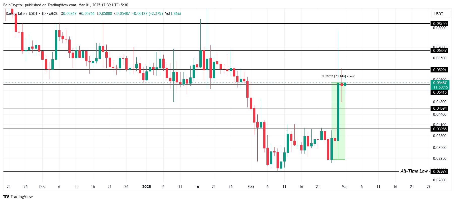 DADDY heeft de markt verrast deze week met een koersstijging van 70%, waarmee de verliezen van februari en meer zijn hersteld. De altcoin wordt momenteel verhandeld op $0,054. Deze rally markeert een verschuiving in het investeerderssentiment, wat mogelijk verdere stijgingen aangeeft als het huidige momentum aanhoudt.