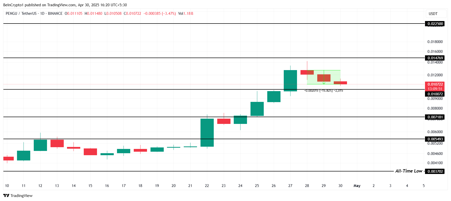 PENGU heeft de afgelopen 48 uur een daling van 15,8% doorgemaakt, maar de meme coin blijft boven het kritieke steunniveau van $0,0100. Deze steun is essentieel om opwaarts momentum te behouden.