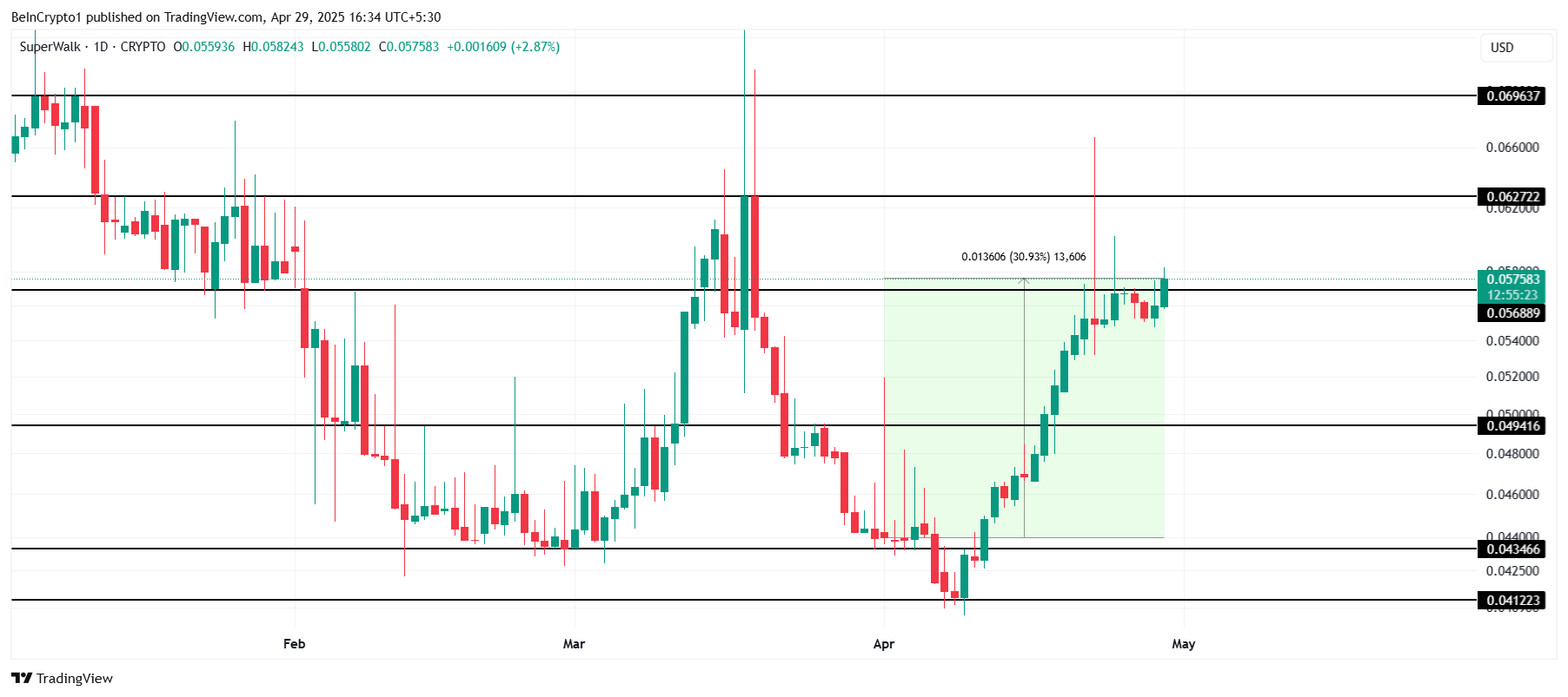 GRND is deze maand met bijna 31% gestegen, maar het is nog steeds niet hersteld van de verliezen van eind maart. De altcoin handelt momenteel boven het kritieke steunniveau van $0,0568, wat positief momentum laat zien. Als GRND zijn positie boven deze steun kan behouden, kan het in de komende dagen verdere winsten zien.