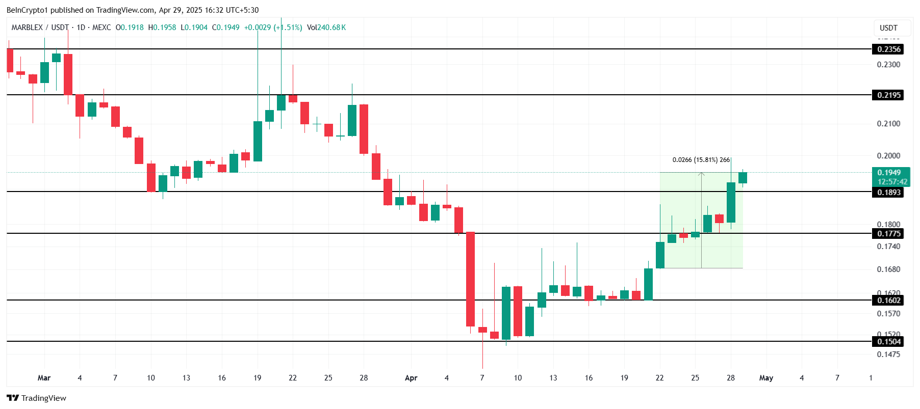Een andere altcoin om in de gaten te houden, MBX, heeft de afgelopen 10 dagen een stijging van 15% doorgemaakt, waarmee het snel de verliezen van eind maart heeft hersteld. Nu MBX de $0,20 nadert, zal het waarschijnlijk zijn opwaartse momentum behouden. Deze verbetering geeft aan dat MBX zijn opwaartse trend kan voortzetten, mogelijk richting nieuwe weerstandsniveaus in de nabije toekomst.