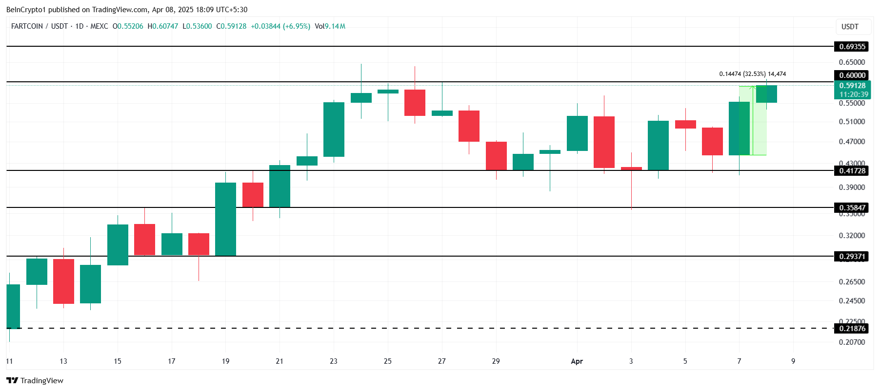 FARTCOIN zag een stijging van 32% in de afgelopen 24 uur, en handelt nu op $0,591. De meme coin nadert nu het weerstandsniveau van $0,600. Als dit momentum aanhoudt, kan FARTCOIN door deze barrière breken en zijn opwaartse beweging voortzetten, op weg naar nieuwe highs in de komende sessies.