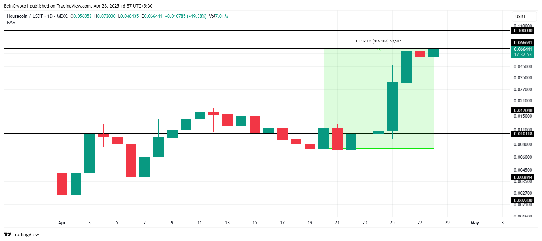 In de afgelopen week is HOUSE met 816% gestegen en handelt momenteel op $0,0664. De altcoin streeft ernaar het $0,0666 niveau om te zetten in steun, een cruciale stap voordat het de $0,1000 weerstand aanpakt. Als dit lukt, zou dit de basis leggen voor verdere groei, wat mogelijk meer investeerders naar de token zou trekken.