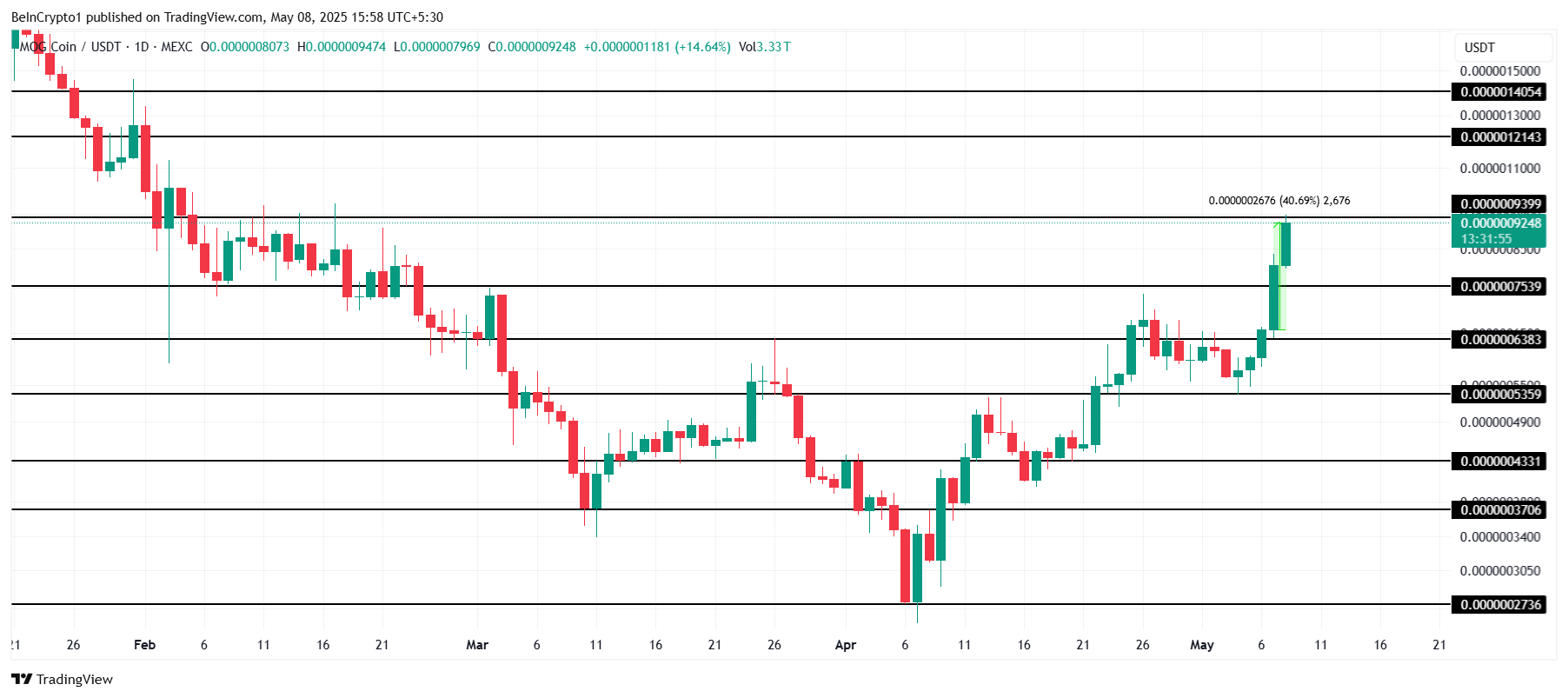 MOG heeft een stijging van 40,69% geboekt en is de best presterende meme coin van de dag geworden. Momenteel handelt het op $0,0000009248 en vertegenwoordigt het de Ethereum blockchain. Deze opmerkelijke stijging duidt op groeiende investeerdersinteresse, en de aanhoudende opwaartse beweging zou MOG verder in de schijnwerpers kunnen zetten in de meme coin-sector.