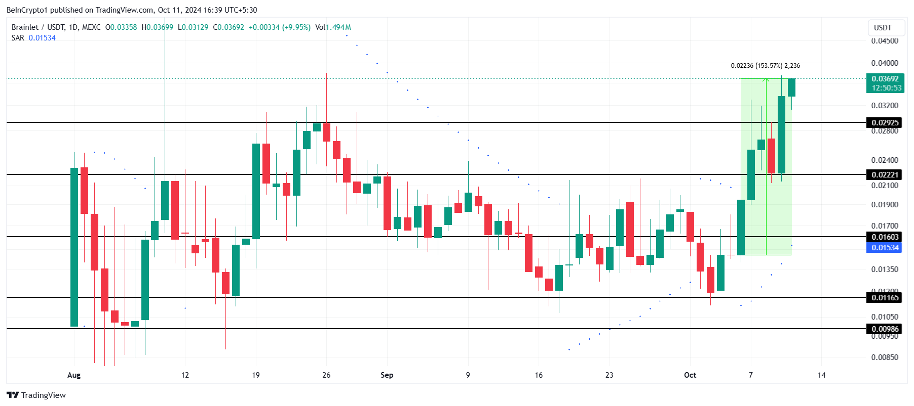 De potentie voor verdere groei blijft sterk, aangezien de Parabolic Support and Resistance (SAR) indicator een voortdurende uptrend signaleert. Als dit momentum aanhoudt, kan Brainlet stijgen naar $0,040, wat het vertrouwen van investeerders verder kan versterken.