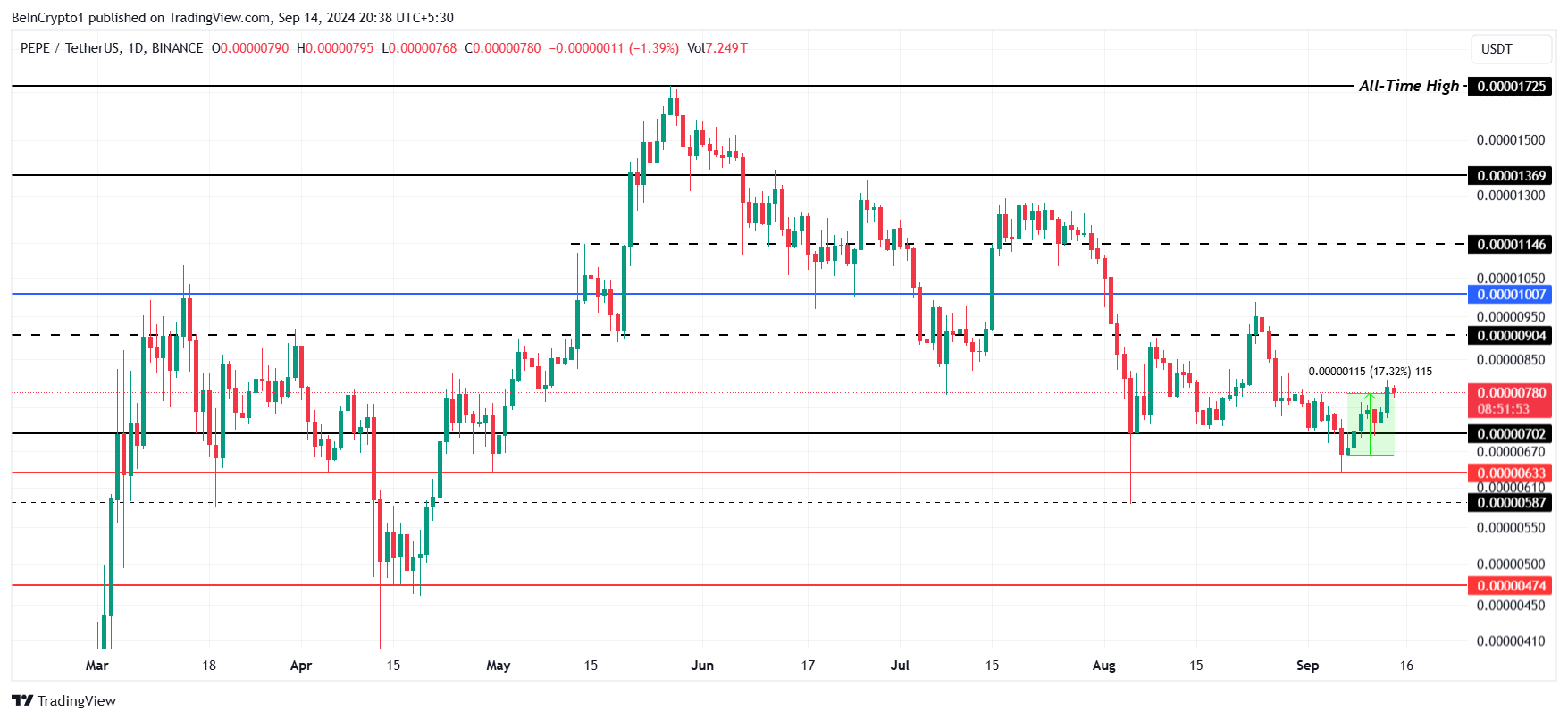 Hoewel een daling onder $0,00000780 onwaarschijnlijk lijkt, zou dit de bullish PEPE coin verwachting ongeldig maken. Een dergelijke daling zou het opwaartse momentum kunnen verstoren, waardoor de coin mogelijk verder zakt naar het niveau van $0,00000633.