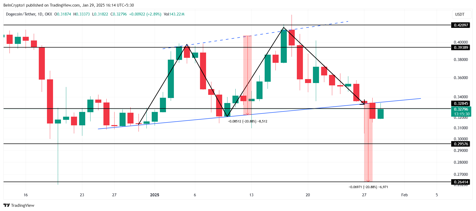 Het patroon suggereert dat Dogecoin een daling van 20% zou kunnen zien, met als doel $0,264. Dit bearish scenario zou waarschijnlijk worden bevestigd als DOGE test en faalt om het $0,295-steunniveau vast te houden.