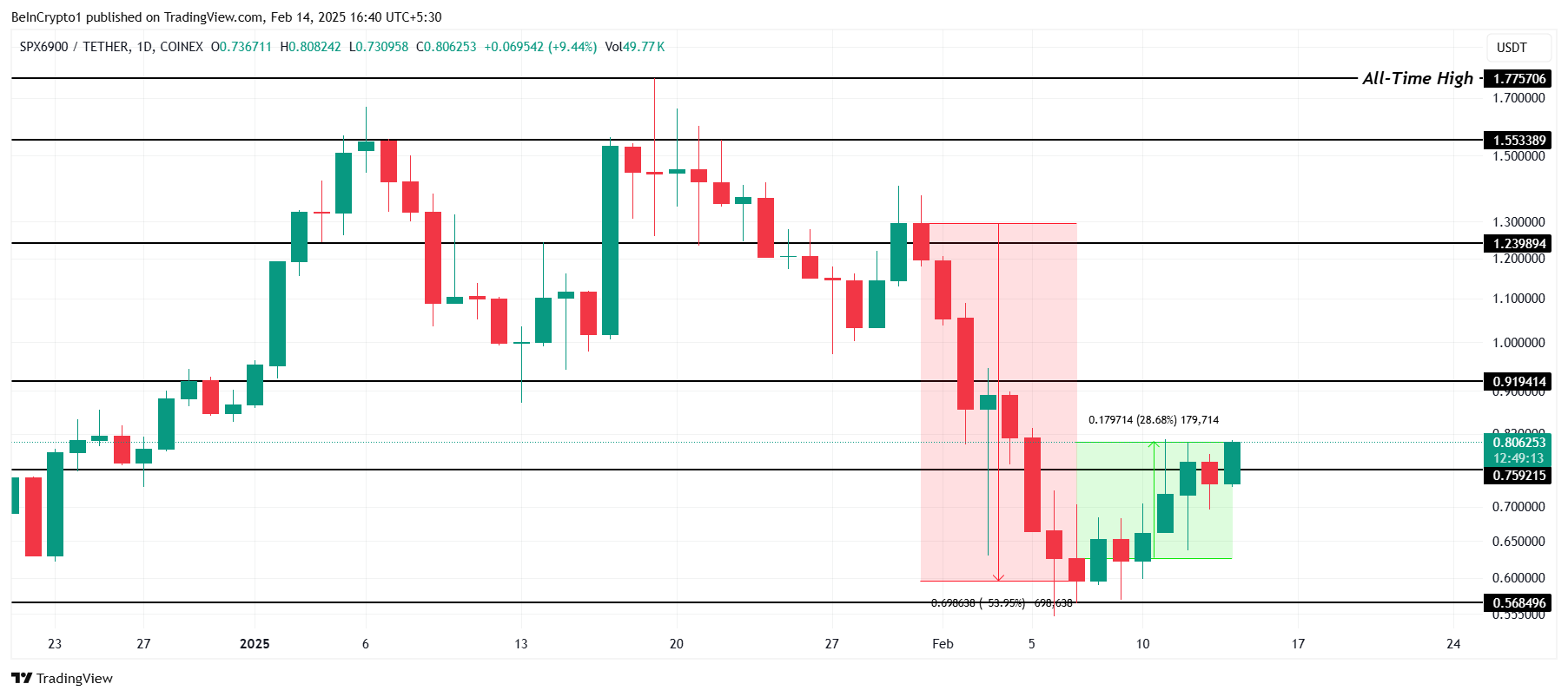 SPX koers steeg met 28% deze week, gedreven door verbeterende marktomstandigheden. Deze opwaartse beweging heeft de meme coin geholpen te herstellen van een scherpe daling van 54% in de vorige week. De opleving wijst op een potentieel voor verdere groei, mits het momentum in de komende dagen kan worden gehandhaafd.