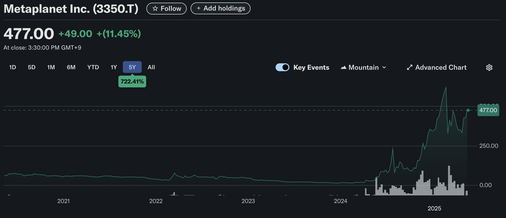 SponsoredNog opvallender is dat sinds het bedrijf in april 2024 begon met het kopen van Bitcoin, de aandelenkoers meer dan 15 keer is gestegen, van ongeveer 34 JPY naar het huidige niveau, waardoor Metaplanet een van de best presterende aandelen in Japan is geworden in deze periode.