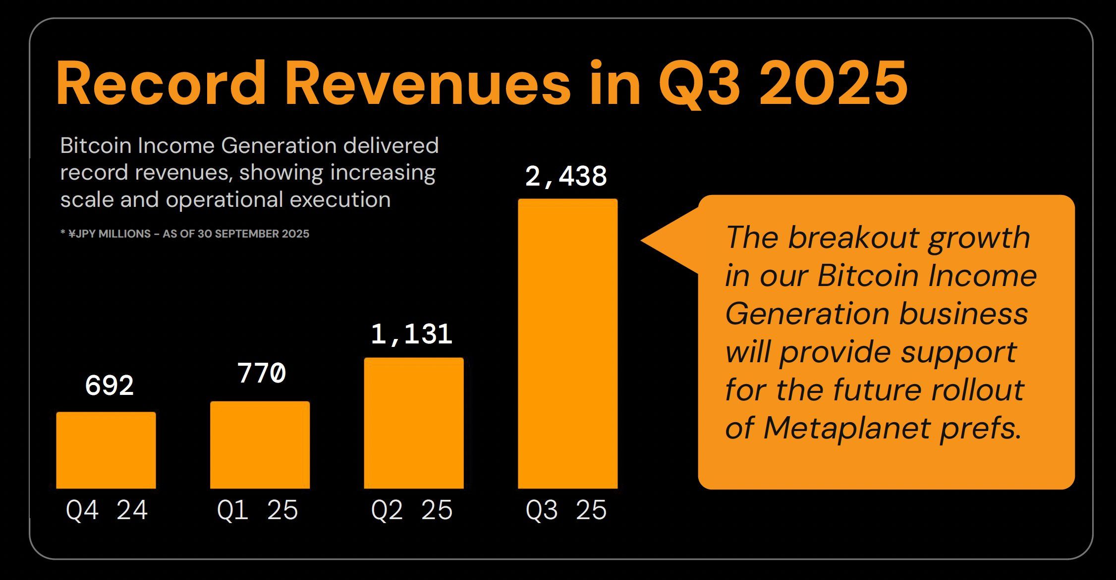 CEO Simon Gerovich onthulde dat het bedrijf in Q3 ¥2,438 miljard ($16,56 miljoen) verdiende uit zijn Bitcoin Income Generation-segment. Dat is meer dan het dubbele van de ¥1,131 miljard ($7,69 miljoen) in Q2. Vergeleken met Q1 steeg de omzet zelfs met een indrukwekkende 216,6%.