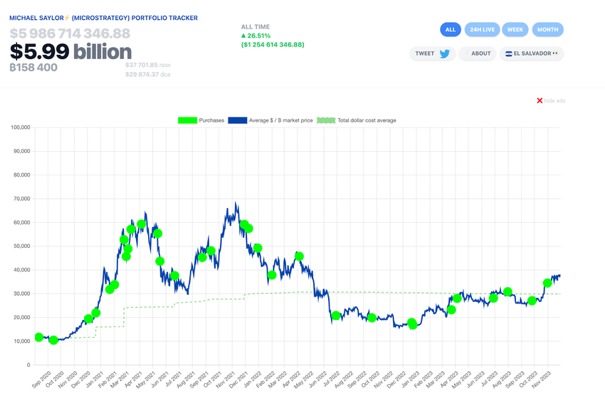 Toen de Bitcoin eind oktober de $31.000 overschreed, werd Saylor eindelijk winstgevend nadat hij de assets gedurende de hele bear market had vastgehouden. Als we de Bitcoin-aankoop van november buiten beschouwing laten, laat Saylor Tracker, een website die de Bitcoin-portefeuille van MicroStrategy volgt, zien dat het bedrijf een ongerealiseerde winst van ongeveer $ 1,2 miljard heeft.