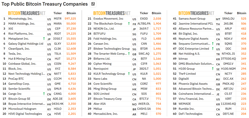 Een van de belangrijkste spelers is MicroStrategy (nu Strategy), dat 597.325 BTC bezit, ter waarde van meer dan $71 miljard op het moment van schrijven.