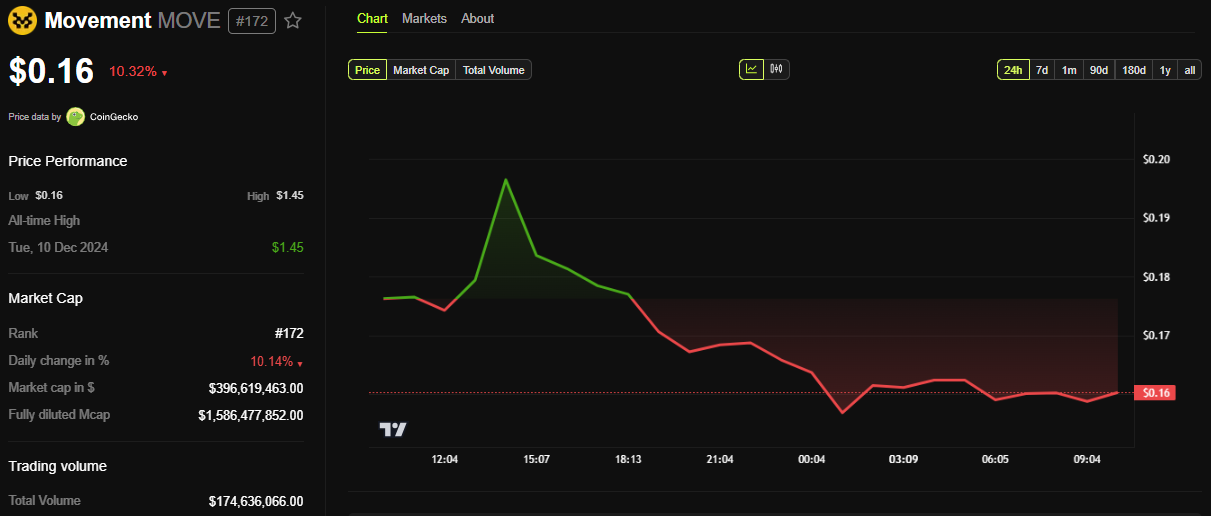 Terwijl de gemeenschap deze ontwikkeling verwerkt, is de MOVE token met meer dan 10% gedaald in de afgelopen 24 uur. BeInCrypto gegevens tonen aan dat MOVE op het moment van schrijven voor $0,16 werd verhandeld.
