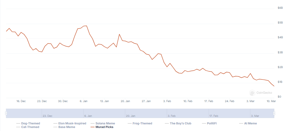 Ondertussen tonen gegevens op CoinGecko aan dat Murad’s meme coin-keuzes sterk in waarde dalen, met bijna 84% sinds de piek van januari van $4,8 miljard.