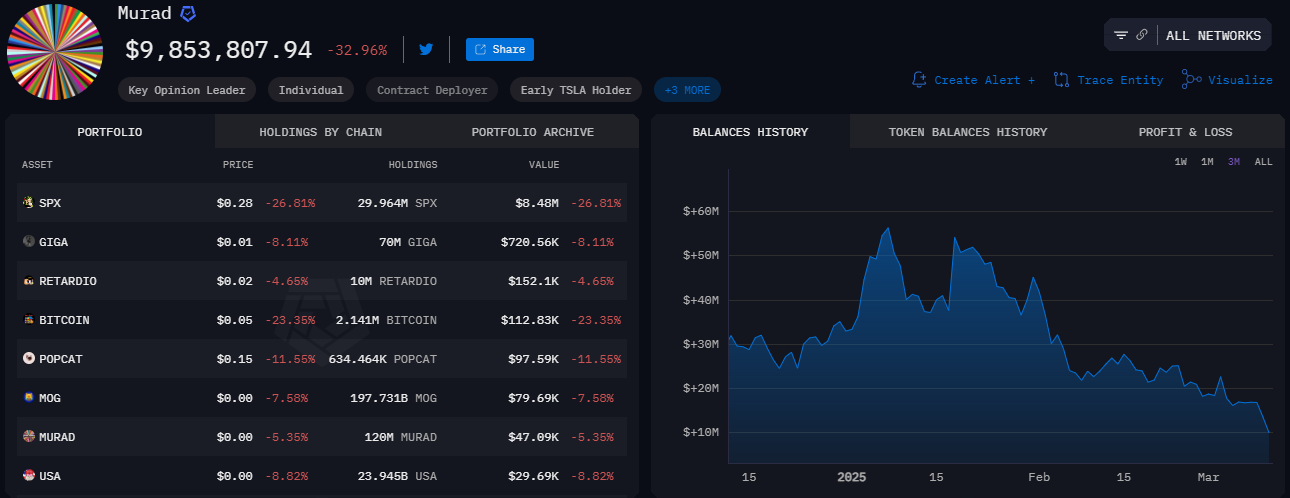 De zelfbenoemde “Meme Coin Jezus,” Murad, zag zijn portfolio met meer dan 82% dalen in slechts twee weken. Ooit had hij een indrukwekkend bedrag van $55 miljoen aan bezittingen, maar gegevens van Arkham Intelligence tonen aan dat zijn portfolio is gekrompen tot minder dan $10 miljoen.