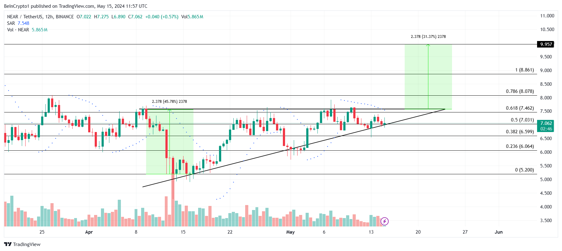 De NEAR koers, die op het moment van schrijven op $7,1 noteert, beweegt zich binnen een stijgende driehoek. Een stijgend driehoekpatroon is een bullish voortzettingspatroon gevormd door een horizontale weerstandslijn en een stijgende trendlijn, wat duidt op toenemende koopdruk.