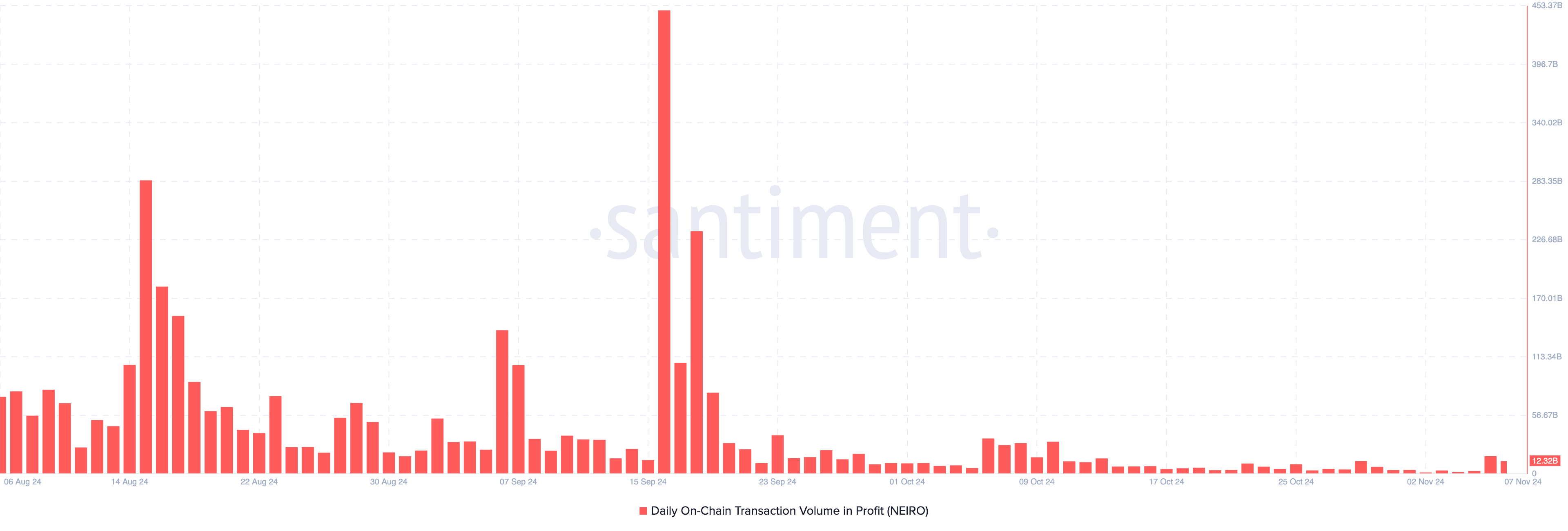 De recente koersstijging van NEIRO betekent dat de meme coin nu 10% verwijderd is van zijn all-time high. Momenteel verhandeld op $0,0021, tonen on-chain gegevens van Santiment aan dat het dagelijkse on-chain transactievolume in winst ongeveer 12,32 miljard is.