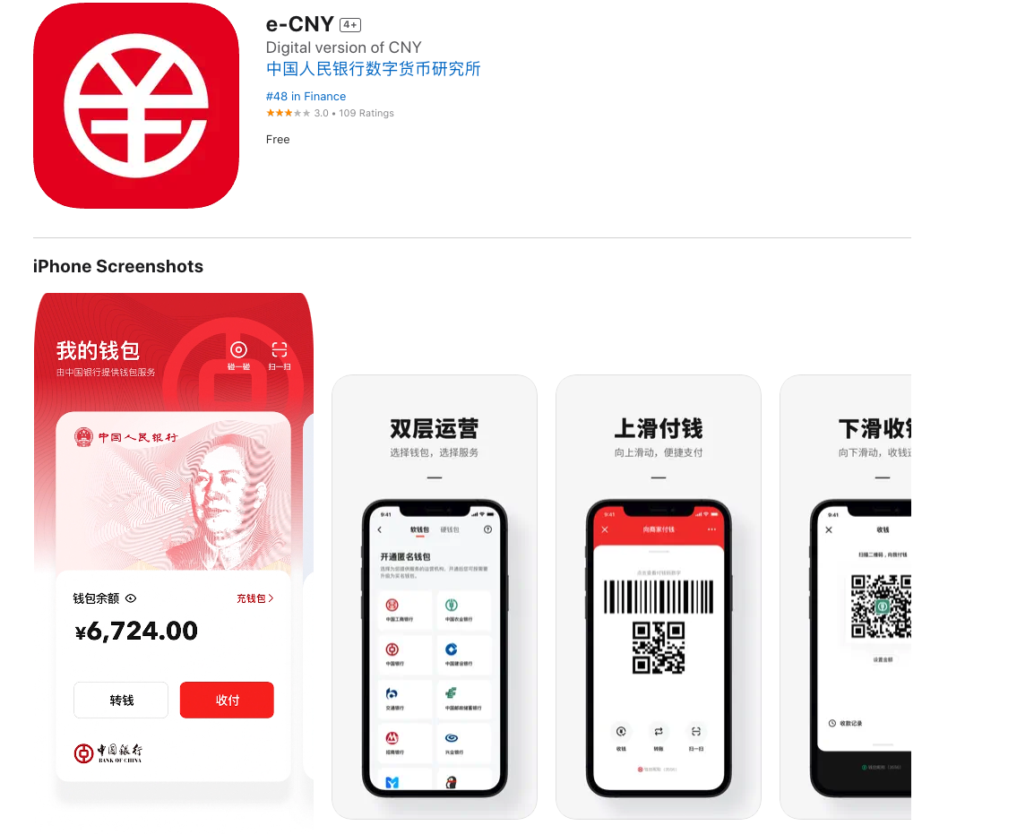 De People’s Bank of China lanceerde haar officiële Shuzi Renminbi app in 2022. De app heeft meerdere digitale wallets om geld over te maken van hun bankrekeningen. De handeling van het tikken om te betalen is gelijk aan een geldopname bij een bankautomaat.
