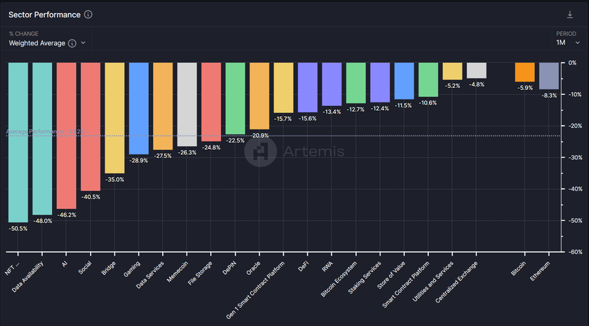 Niet-fungibele tokens (NFT’s), ooit geprezen als de toekomst van digitale verzamelobjecten, kenden een scherpe terugval in juni. Volgens het cryptoanalyseplatform Artemis presteerde de NFT-sector het slechtst van 21 sectoren, met een duizelingwekkende daling van 51,5%.