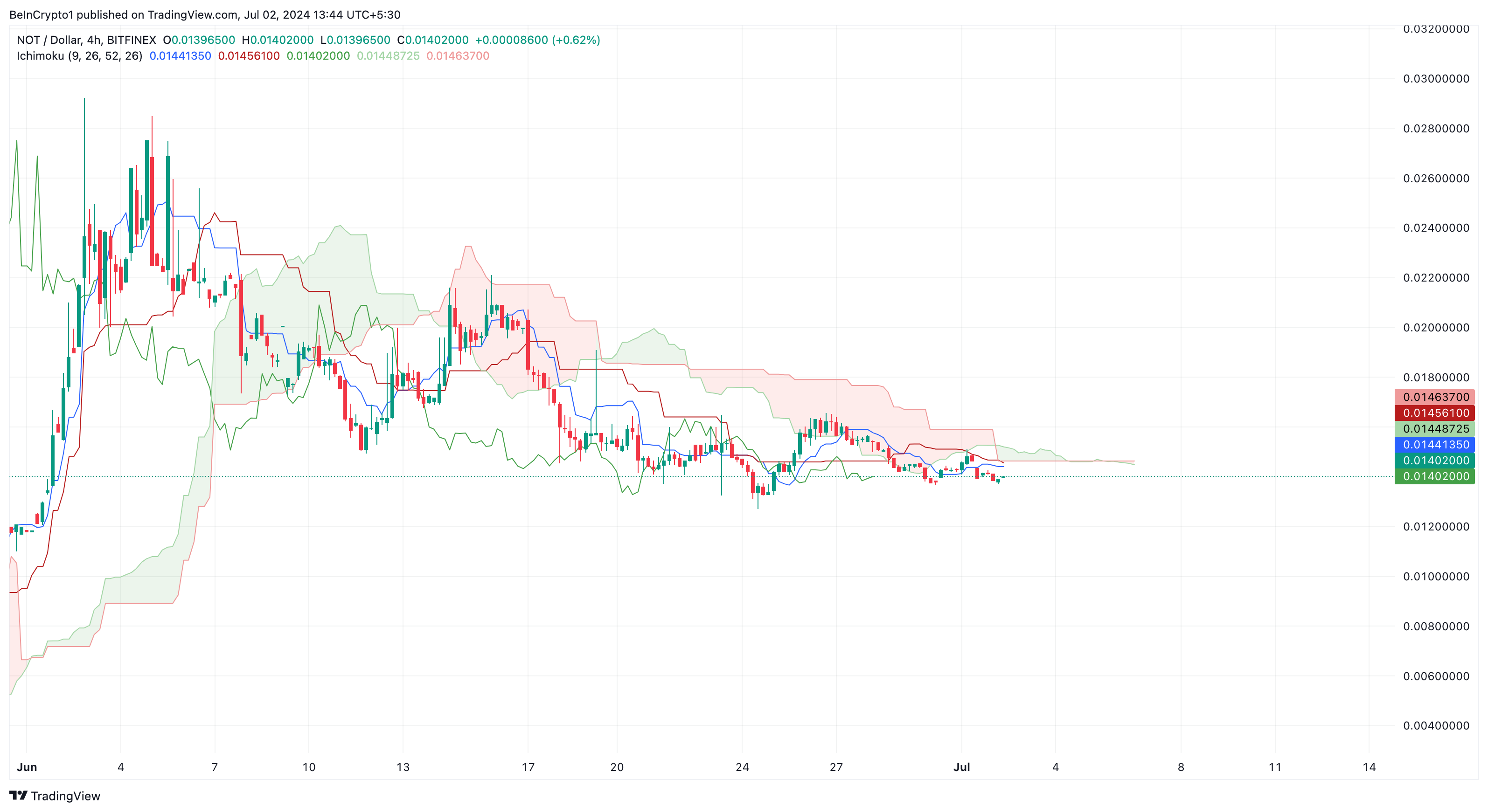 Als de cloud boven de koers is, betekent dit dat de trend neerwaarts is. Maar wanneer de koersen boven de cloud zijn, duidt dit op een uptrend. Op het moment van schrijven is de cloud boven de NOT koers, wat aangeeft dat de cryptocurrency enige weerstand kan ondervinden bij pogingen om hoger te handelen.