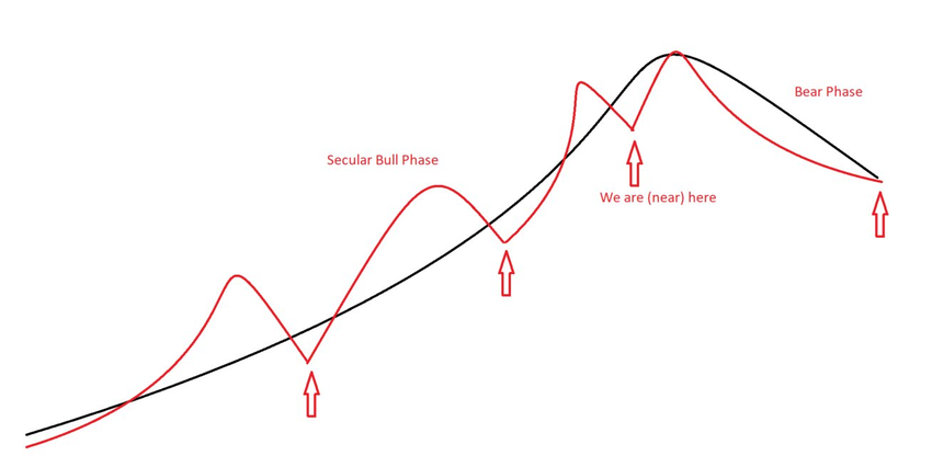 “De (koers)TOP van de cyclus komt vroeg in de periode van 4 jaar. De periode wordt gemeten van dieptepunt tot dieptepunt. Dat geeft meer tijd om te dalen over de periode. En over het algemeen resulteert dit in een lagere low die gevormd wordt van het ene dieptepunt van de cyclus naar het andere. Het is de echte bear of dalende 4-jaars cyclus die de langere (16-jaars in dit geval) cyclus de tijd geeft om zijn eigen bodem te vormen… Laatste cyclus topt vroeg om 16-jarige cyclus ruimte te geven in dalende (seculiere bear) fase,” legde Loukas uit.