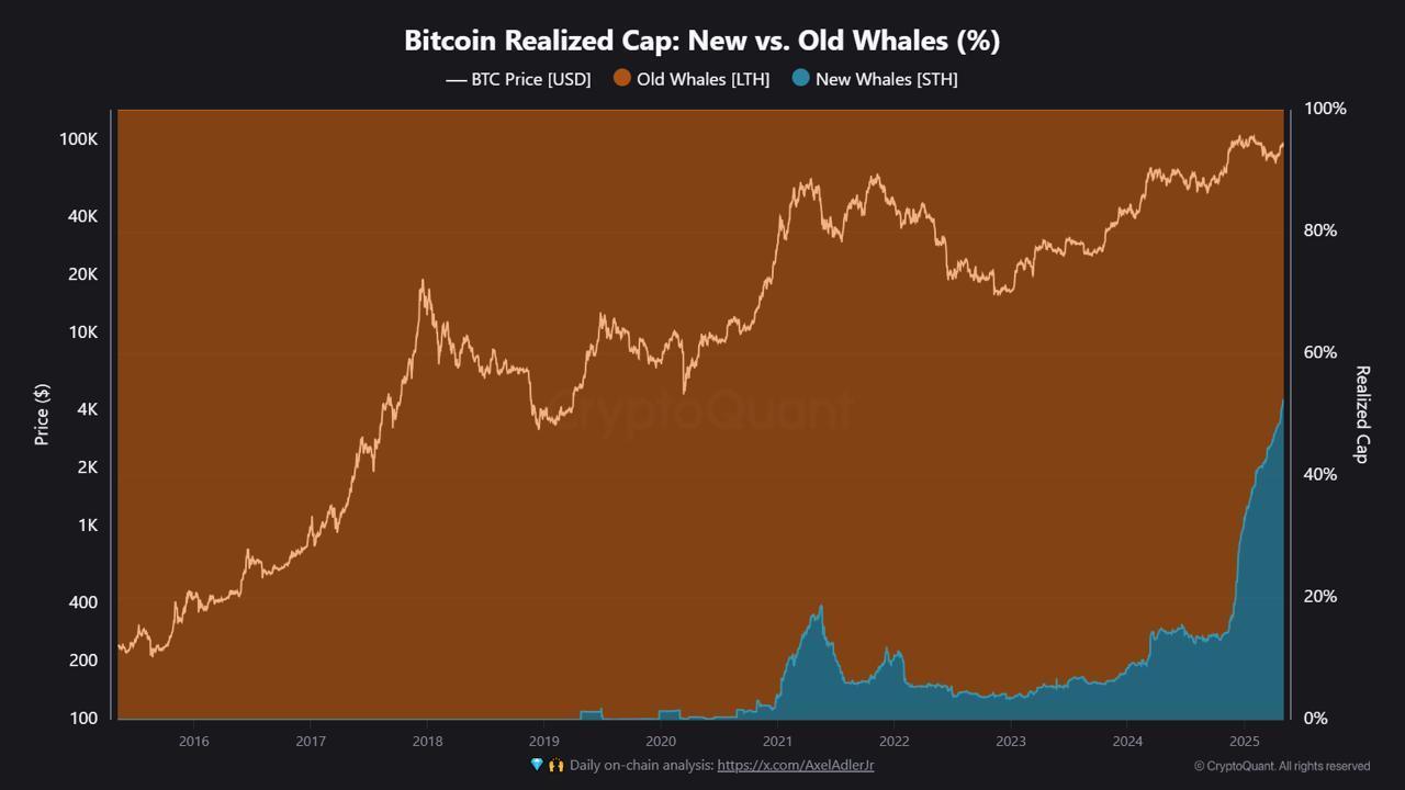 Een on-chain rapport van CryptoQuant toont aan dat kortetermijn “Nieuwe Whales” nu 52,4% van Bitcoin’s Whales Realized Cap bezitten, voor het eerst meer dan langetermijnhouders.
