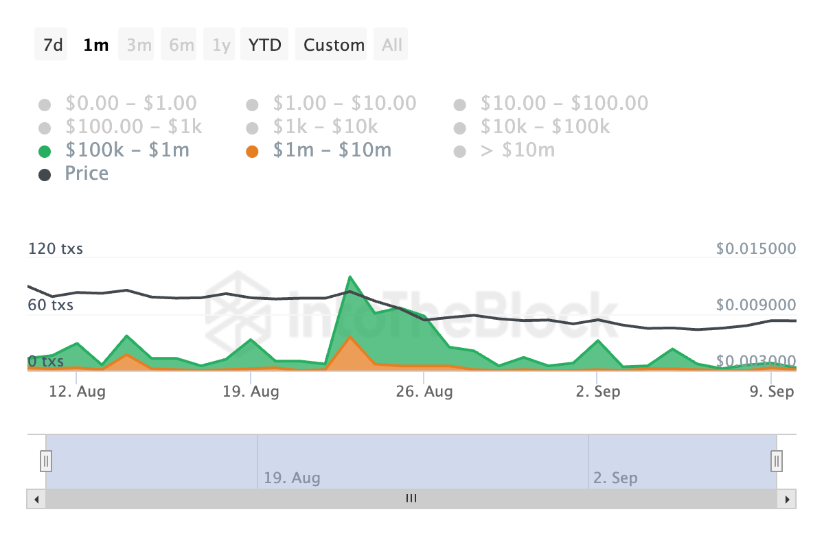 NOT whales hebben hun blootstelling aanzienlijk verminderd, zoals blijkt uit de scherpe daling van grote transacties. In de afgelopen 30 dagen is het aantal NOT-transacties met een waarde tussen $100.000 en $1 miljoen met 92% gedaald, wat wijst op een gebrek aan interesse onder grote houders.