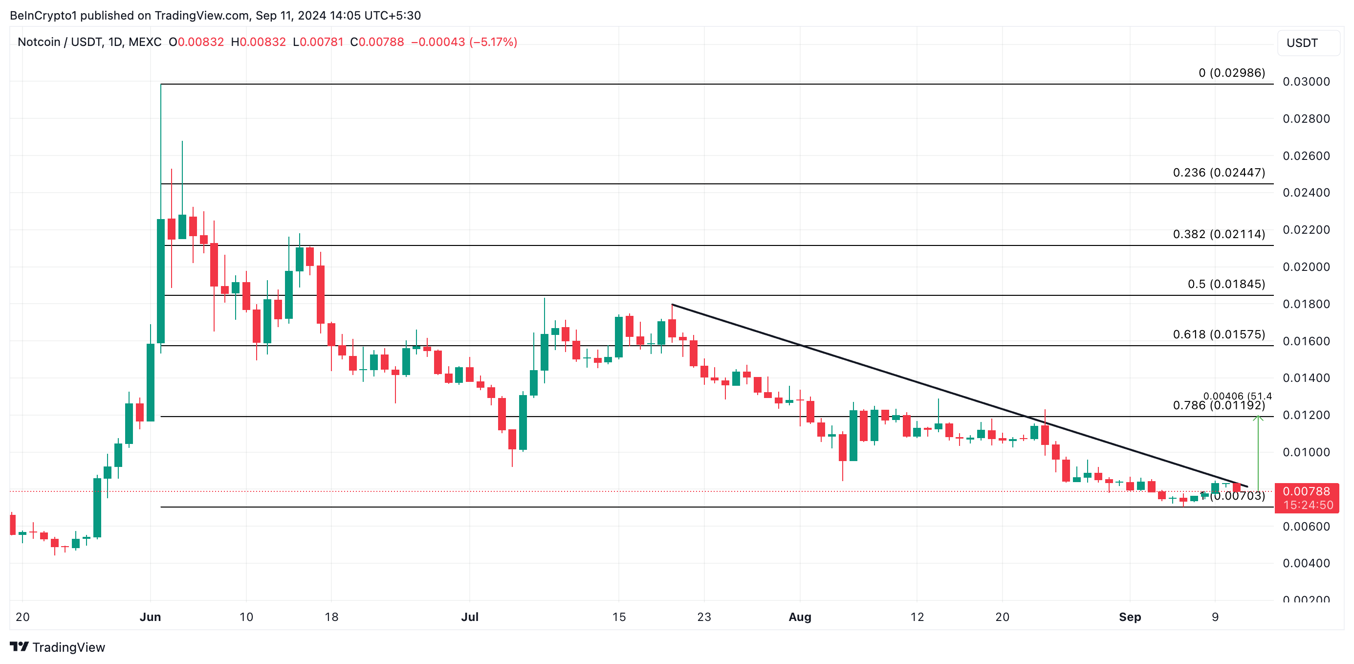 Notcoin (NOT) bears hebben een duidelijk doel: de koers van de altcoin terugbrengen naar zijn jaarlijkse low van $0,005. Dit blijkt uit de strijd van de token om boven de dalende trendlijn uit te komen waar het sinds juli onder heeft gehandeld.