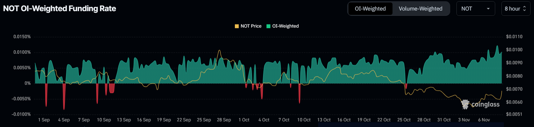 In de afgelopen maand is de funding rate van Notcoin consistent positief gebleven, wat wijst op een overwegend optimistische kijk onder handelaren. Ondanks de dalende NOT koers in oktober, hielden handelaren stand, hun posities behoudend aangezien de funding rates sterke overtuiging aantoonden. Deze veerkracht in het aangezicht van koersdalingen suggereert dat Notcoin-enthousiastelingen vertrouwen hebben in een mogelijk herstel, wat wijst op stabiele langetermijnsteun vanuit de gemeenschap.