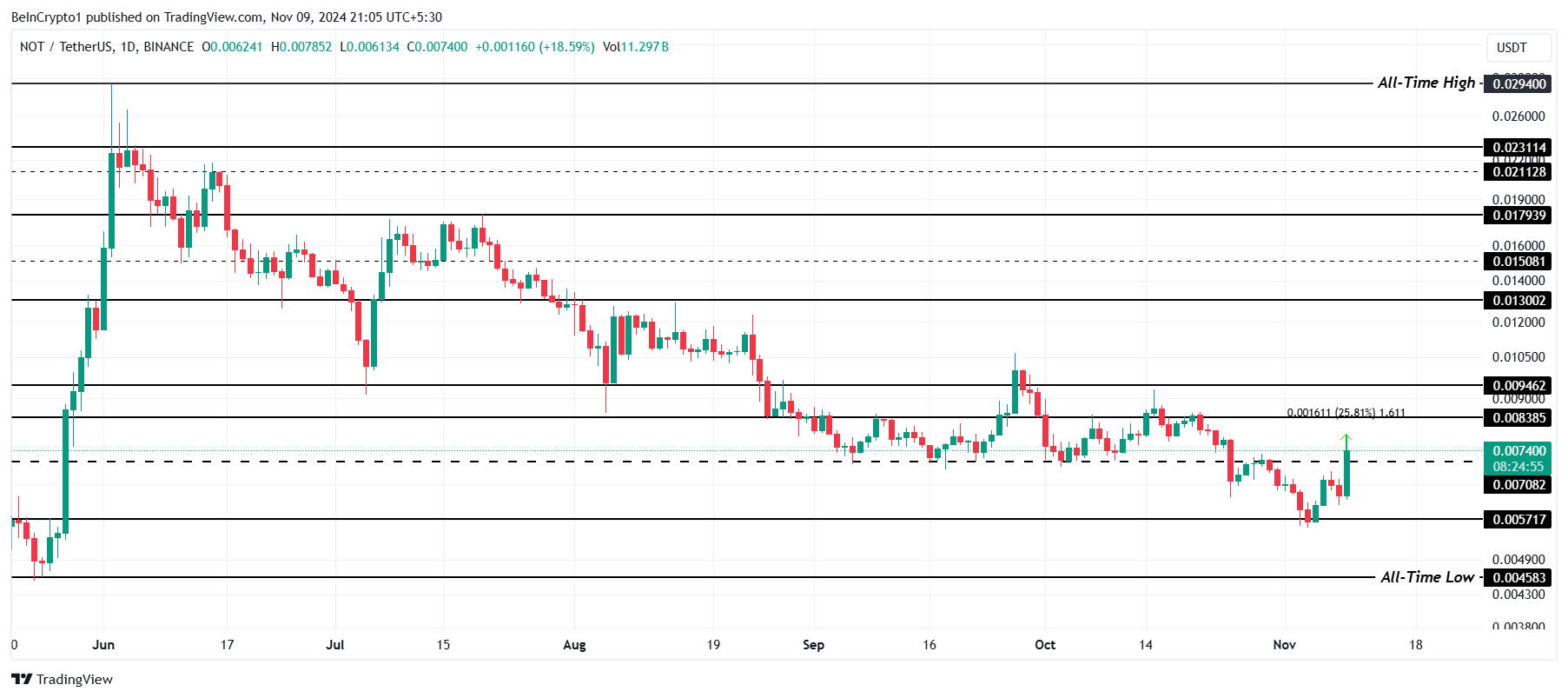 Een opmerkelijke rally van 25% heeft optimisme gewekt, wat NOT-handelaren een broodnodige impuls geeft. Dit opwaartse momentum kan een verschuiving signaleren naarmate het positieve sentiment binnen de Notcoin-gemeenschap groeit.