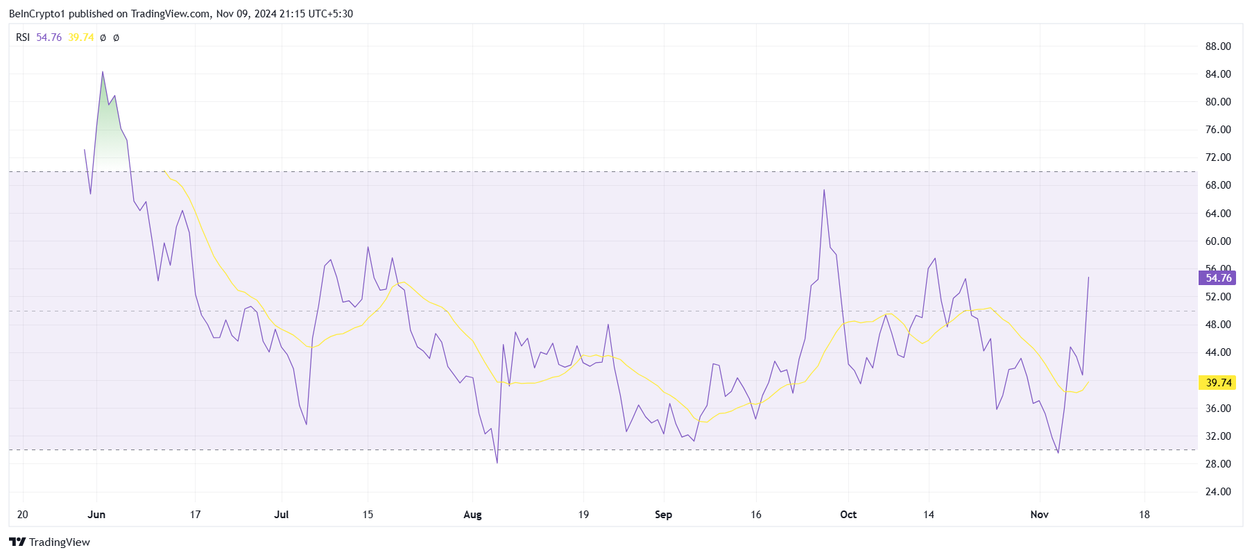 Het macro-momentum van Notcoin begint kracht te tonen, ondersteund door technische indicatoren zoals de Relative Strength Index (RSI). De RSI wint momenteel aan bullish momentum, wat suggereert dat de koopinteresse toeneemt. Echter, om deze groei te ondersteunen, moet NOT de neutrale lijn op 50,0 op de RSI omzetten in een steunniveau.
