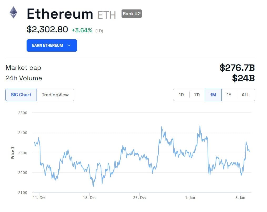 De Ethereum koers steeg op de dag met 3,6%. Op het moment van schrijven staat de ETH koers net boven $2.300.