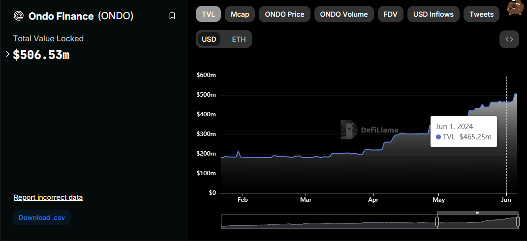 Ondo Finance’s Total Value Locked (TVL) is sinds mei met 43% geëxplodeerd, van $352,67 miljoen op 1 mei naar $506 miljoen op 6 juni.