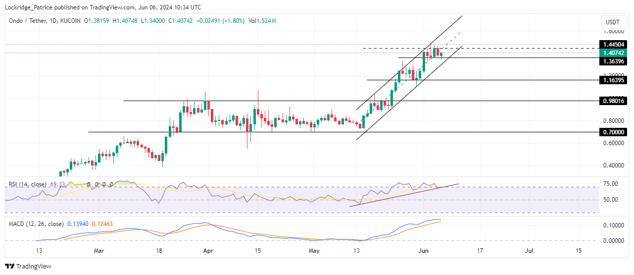 Ondo’s native token wordt verhandeld met bullish sentiment, met steun op $1,36, waarmee de 23% winst van de afgelopen zeven dagen wordt verdedigd. In de afgelopen 24 uur steeg de koers van de RWA token met bijna 3% te midden van aanhoudende bullish inspanningen in de richting van verdere opwaartse trend.