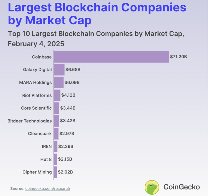 Het rapport, uitgebracht op 4 februari, toont slechts 46 opmerkelijke beursgenoteerde blockchain-bedrijven. De meerderheid, in totaal 24, is genoteerd aan de NASDAQ, met Coinbase (COIN) als koploper met een aanzienlijke marge. Coinbase, de grootste in de VS gevestigde crypto exchange, heeft een marktkapitalisatie van $71,2 miljard.