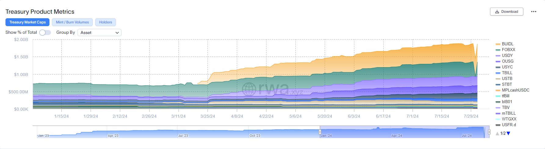 De tokenized US treasury-markt heeft een opmerkelijke groei gezien in 2024. Gegevens van RWA.xyz geven aan dat de totale waarde van dit segment is gegroeid van $726,23 miljoen naar $1,88 miljard tot nu toe dit jaar. BlackRock’s BUIDL en Franklin Templeton’s FOBXX zijn belangrijke bijdragers, met marktkapitalisaties van $522,81 miljoen en $414,300 miljoen respectievelijk.