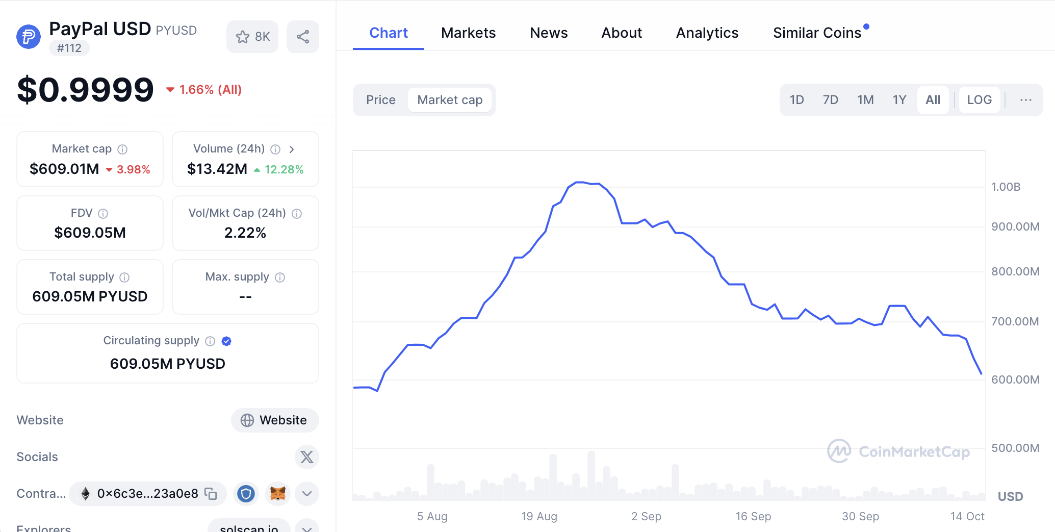 Echter, deze zomer zag PYUSD een nieuwe golf van veel groter succes. Zijn marktkapitalisatie steeg gestaag van juli tot augustus, en bereikte all-time highs. Tegen oktober was echter bijna al deze groei verdwenen, en PYUSD verloor ongeveer 40% van zijn waarde ten opzichte van zijn piek in augustus. Wat kan dit verklaren?