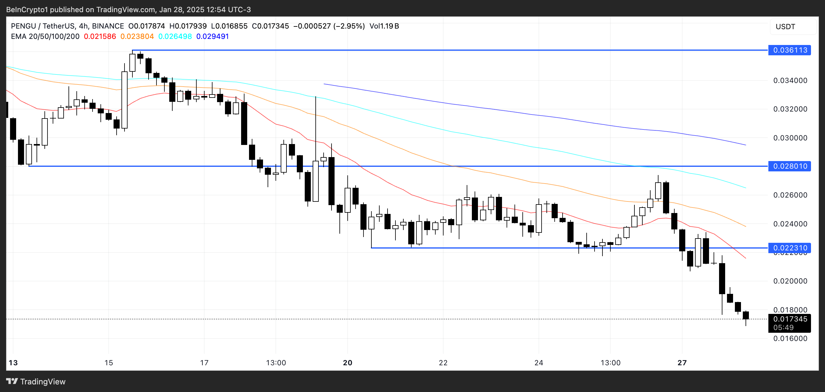 PENGU koers verwachting: blijft het nieuwe lows testen?