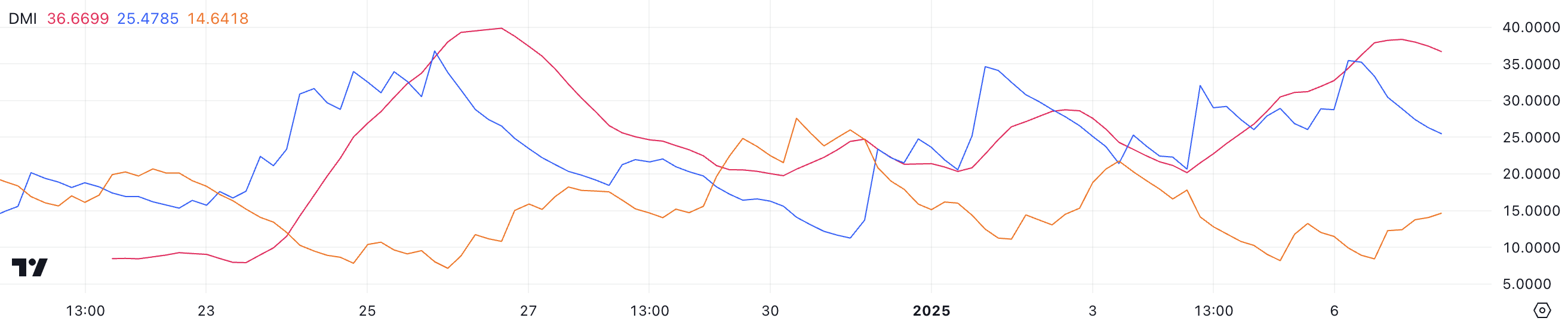 De directionele indicatoren laten de aard van de trend zien. De +DI, die koopdruk aangeeft, daalde van 35 naar 25,4, wat verzwakkend bullish momentum suggereert. Tegelijkertijd steeg de -DI, die verkoopdruk weerspiegelt, van 8,4 naar 14,6, wat wijst op toenemende bearish activiteit.
