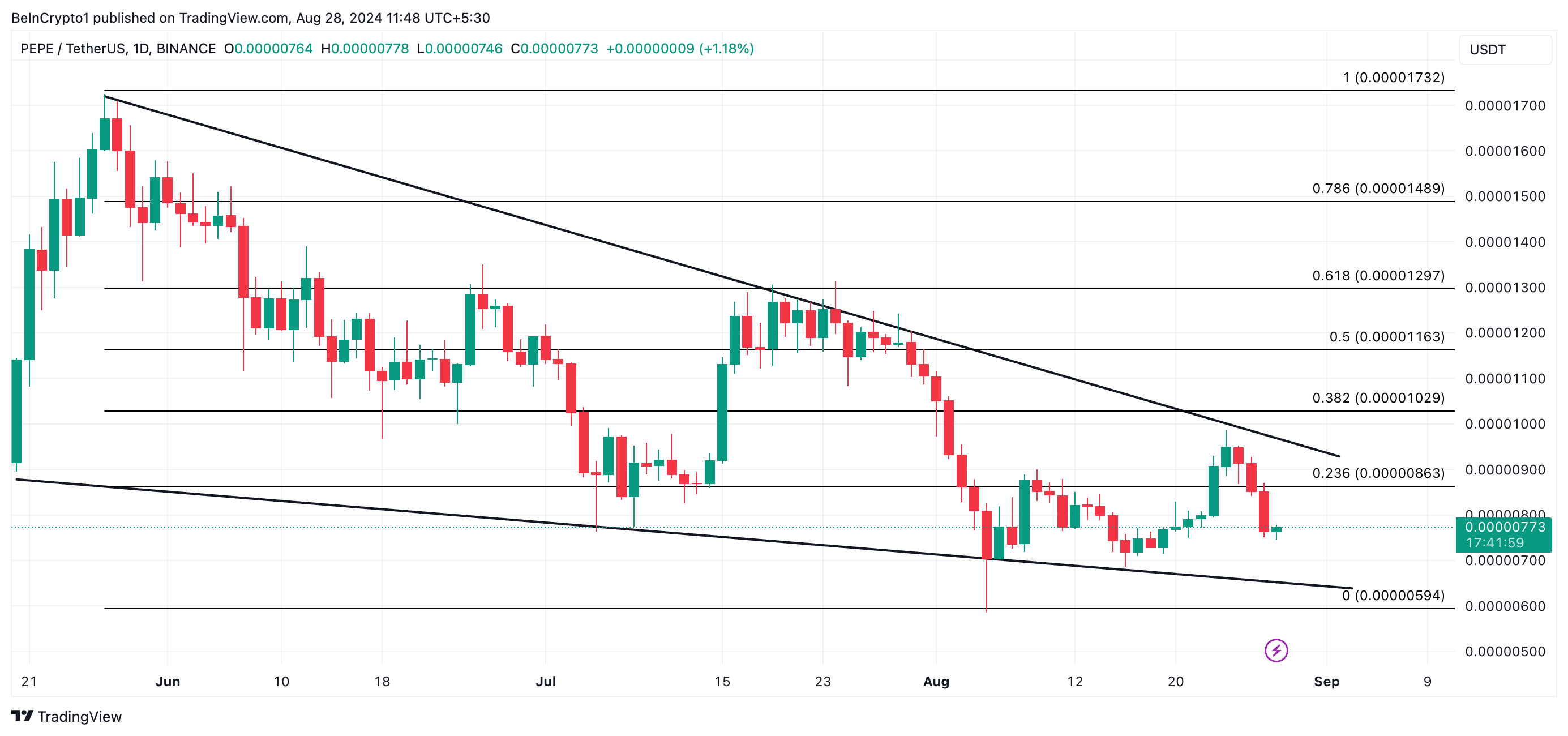 PEPE kan echter een uitzondering vormen. Sinds 25 augustus bevindt de koers van de meme coin zich in een neerwaartse trend, met een daling van 15%, waardoor het dichter bij de onderste lijn van de dalende wig komt.