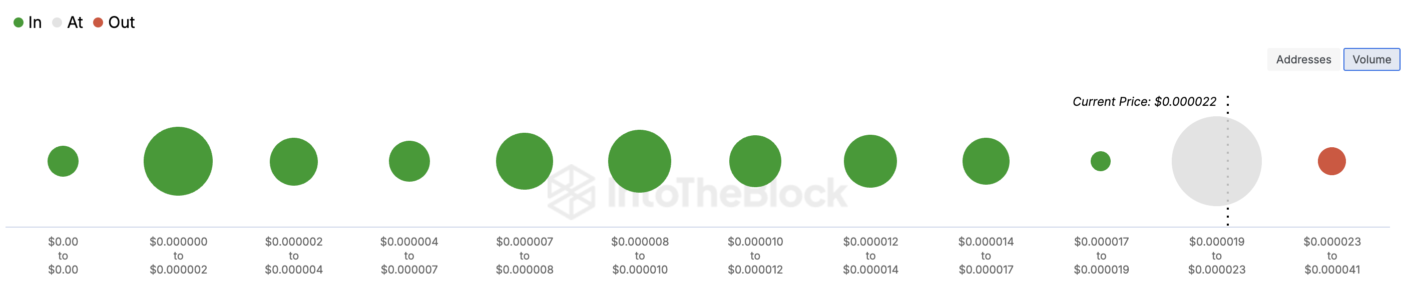 Grote clusters duiden op sterkere steun of weerstandsniveaus op die prijspunten, omdat ze gebieden vertegenwoordigen waar veel investeerders gepositioneerd zijn. Volgens IntoTheBlock houden slechts 3.940 adressen 2,76 biljoen tokens vast, en verzameld rond $0,000023 zijn uit het geld.
