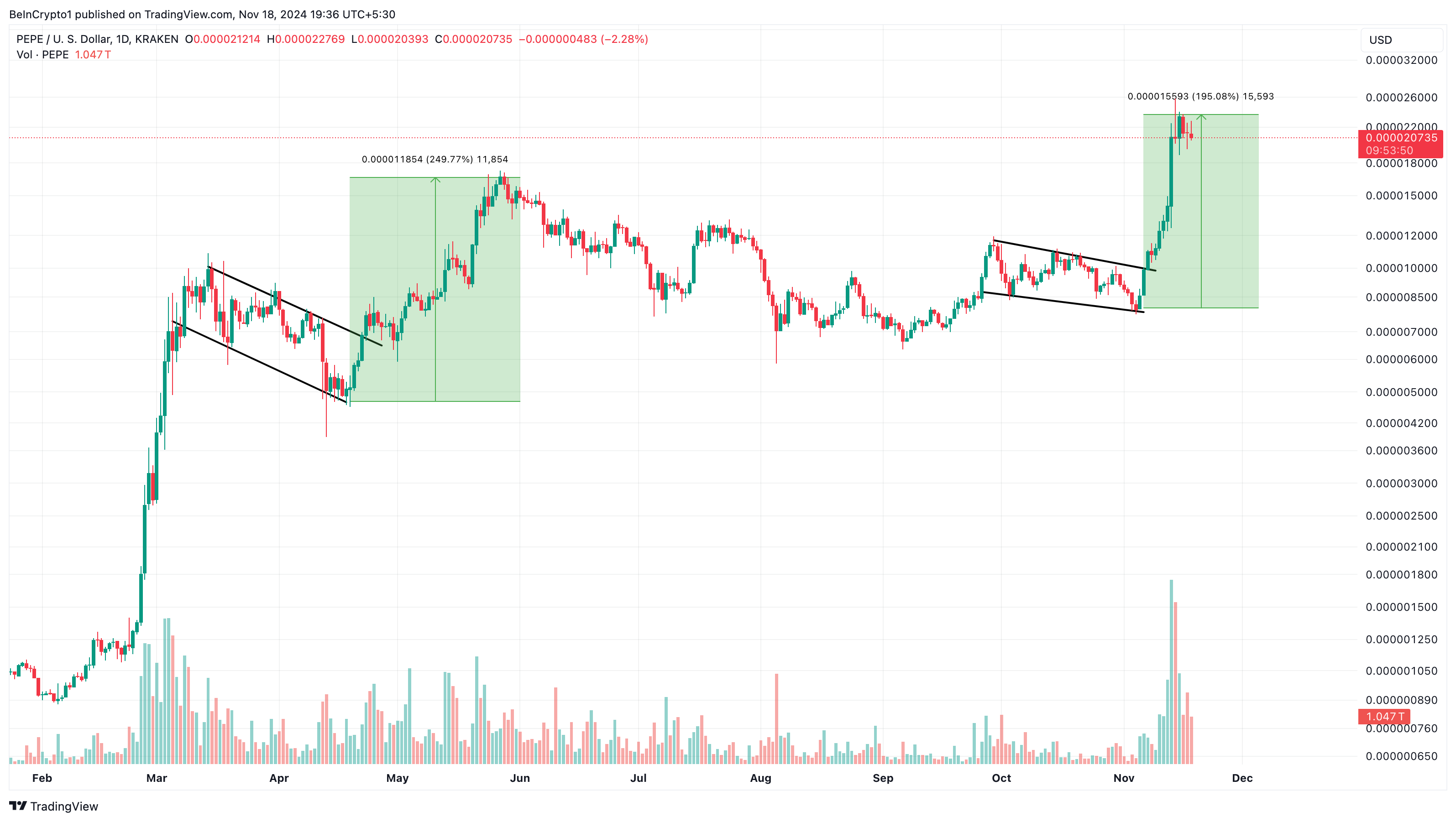 Op de dagelijkse PEPE koers grafiek lijkt het token een vergelijkbare beweging te hebben gevolgd als zijn stijging van 250% rond maart. Destijds brak de op een kikker gebaseerde meme coin uit een dalend kanaal.