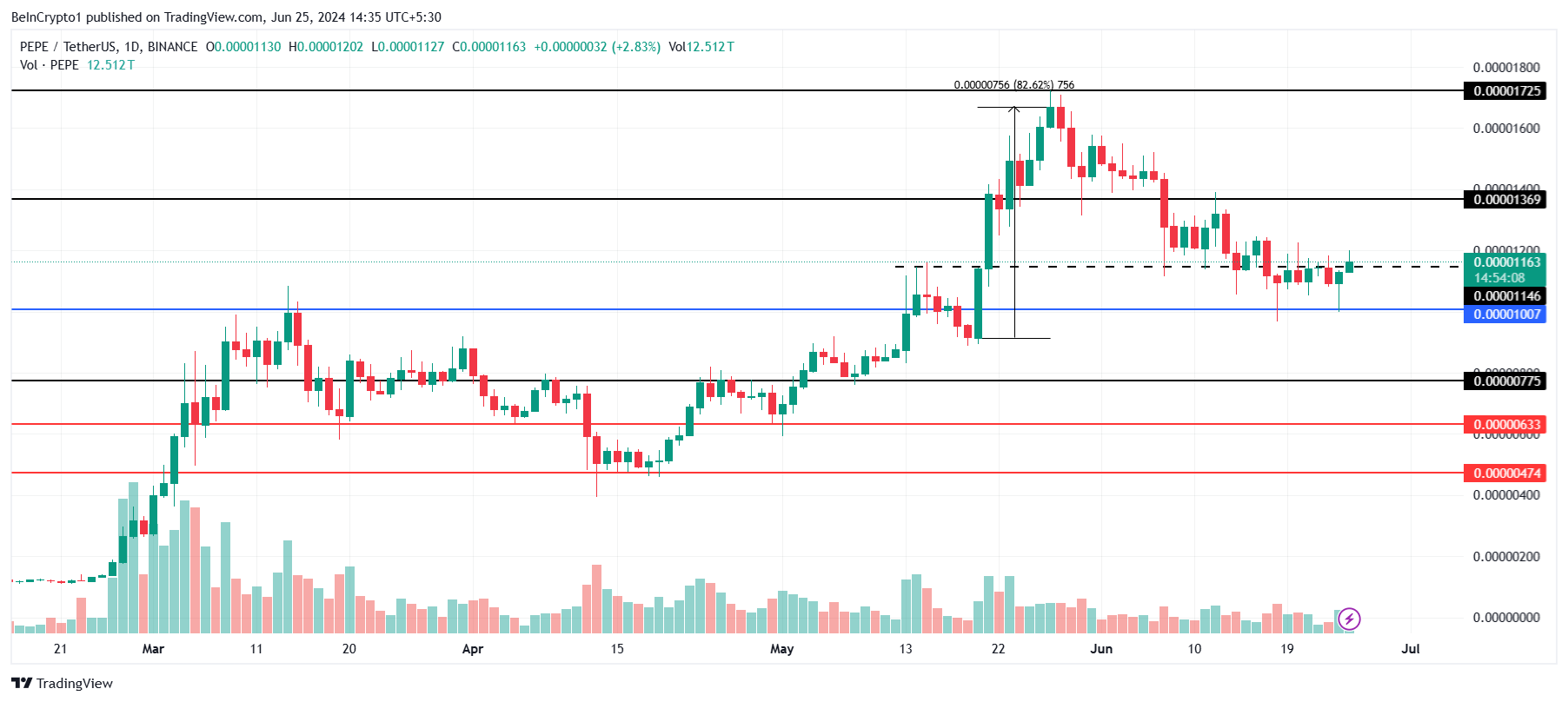 PEPE, dat wordt verhandeld op $0,00001163, probeert momenteel te stuiteren van de steun op $0,00001146. Dit zou een stijging mogelijk maken naar $0.00001369, het volgende belangrijke weerstandniveau voor de meme coin.