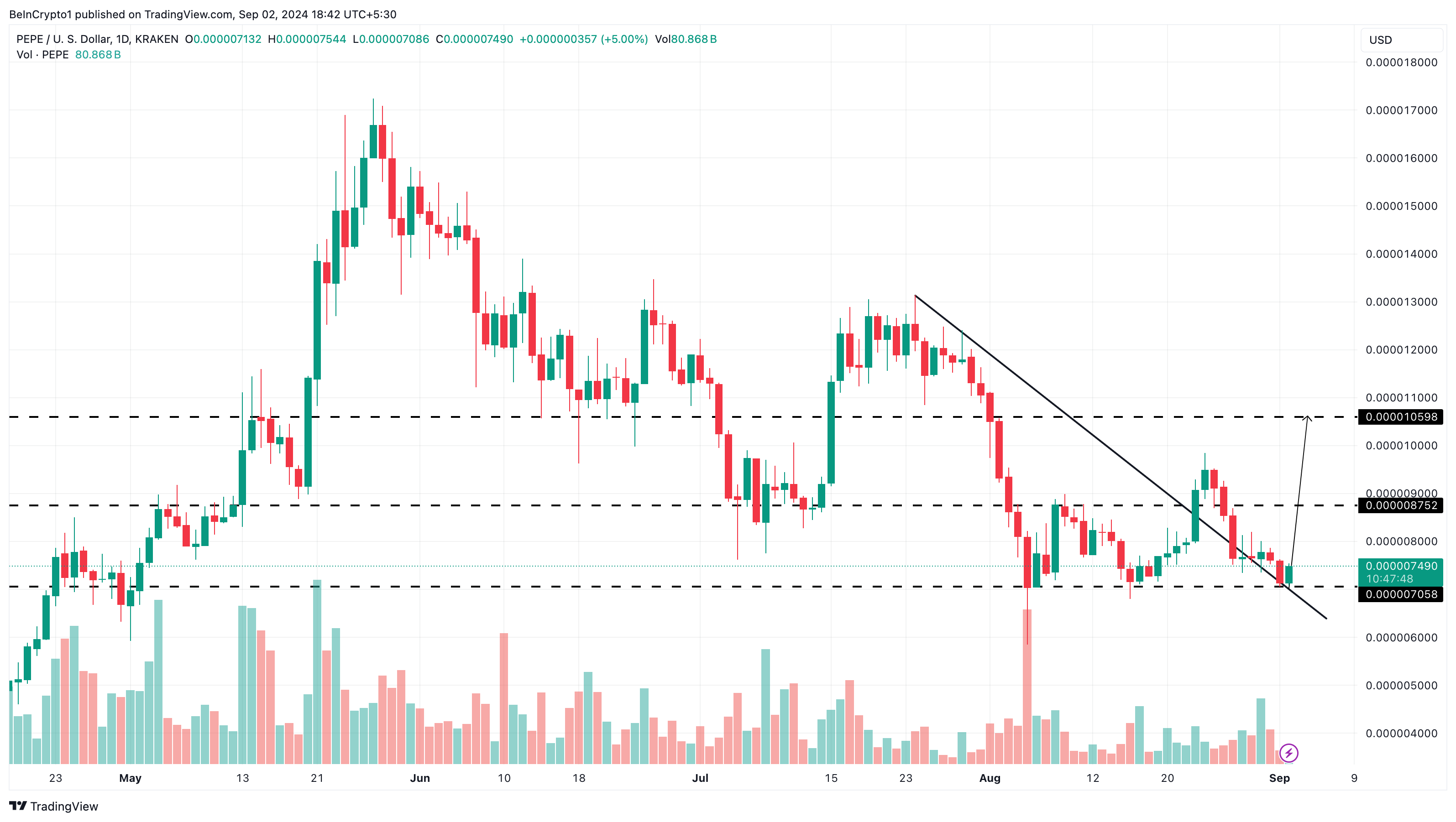 Pepe dagelijkse analyse. Bron: TradingView