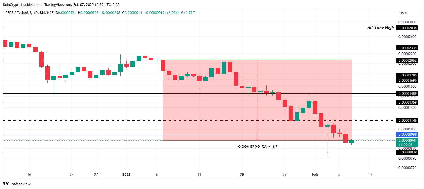 PEPE handelt momenteel op $0,00000941, onder het kritieke steunniveau van $0,00001000. Dit markeert een 3-maandse low voor de meme coin, waardoor het een van de slechtst presterende activa van de maand is. De aanhoudende verkoopdruk heeft het moeilijk gemaakt voor PEPE om opwaarts momentum te herwinnen.