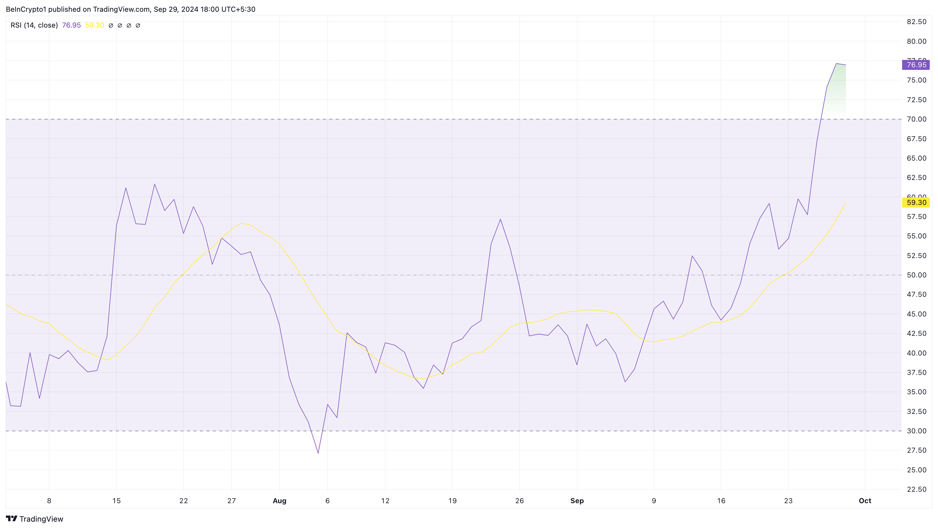 De RSI toont ook aan of een cryptocurrency overbought of oversold is. Aflezingen boven 70,00 betekenen dat het overbought is, terwijl die onder 30,00 betekenen dat het oversold is. Zoals hieronder te zien is, toont de RSI op de dagelijkse grafiek van PEPE/USD aan dat de token overbought is, en de koers zou kunnen dalen.