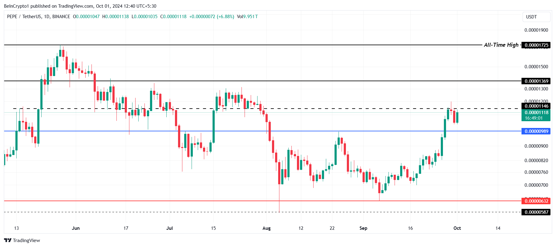 SponsoredDe weerstand op $0,00001369 vormt een cruciaal niveau dat PEPE belemmert in het bereiken van een nieuwe all-time high boven $0,00001725. Met veel investeerders die klaarstaan om winst te nemen, zal het een uitdaging zijn om deze barrière te doorbreken. Mocht PEPE er niet in slagen om $0,00001369 te overstijgen, dan zal het waarschijnlijk consolideren tussen deze weerstand en $0,00000989 in de nabije toekomst.