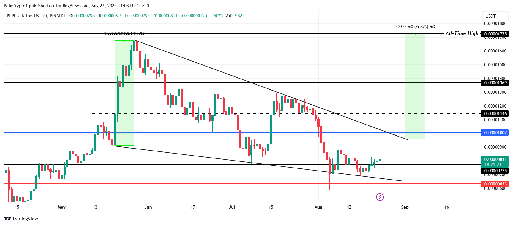 De PEPE koers handelt op $0,00000811, nadat het de weerstand op $0,00000775 heeft doorbroken. Een bounce vanaf dit nieuwe steunniveau kan de opwaartse trend voortzetten. Het doel is om $0,00001007 te converteren naar steun na de uitbraak uit de dalende wig.