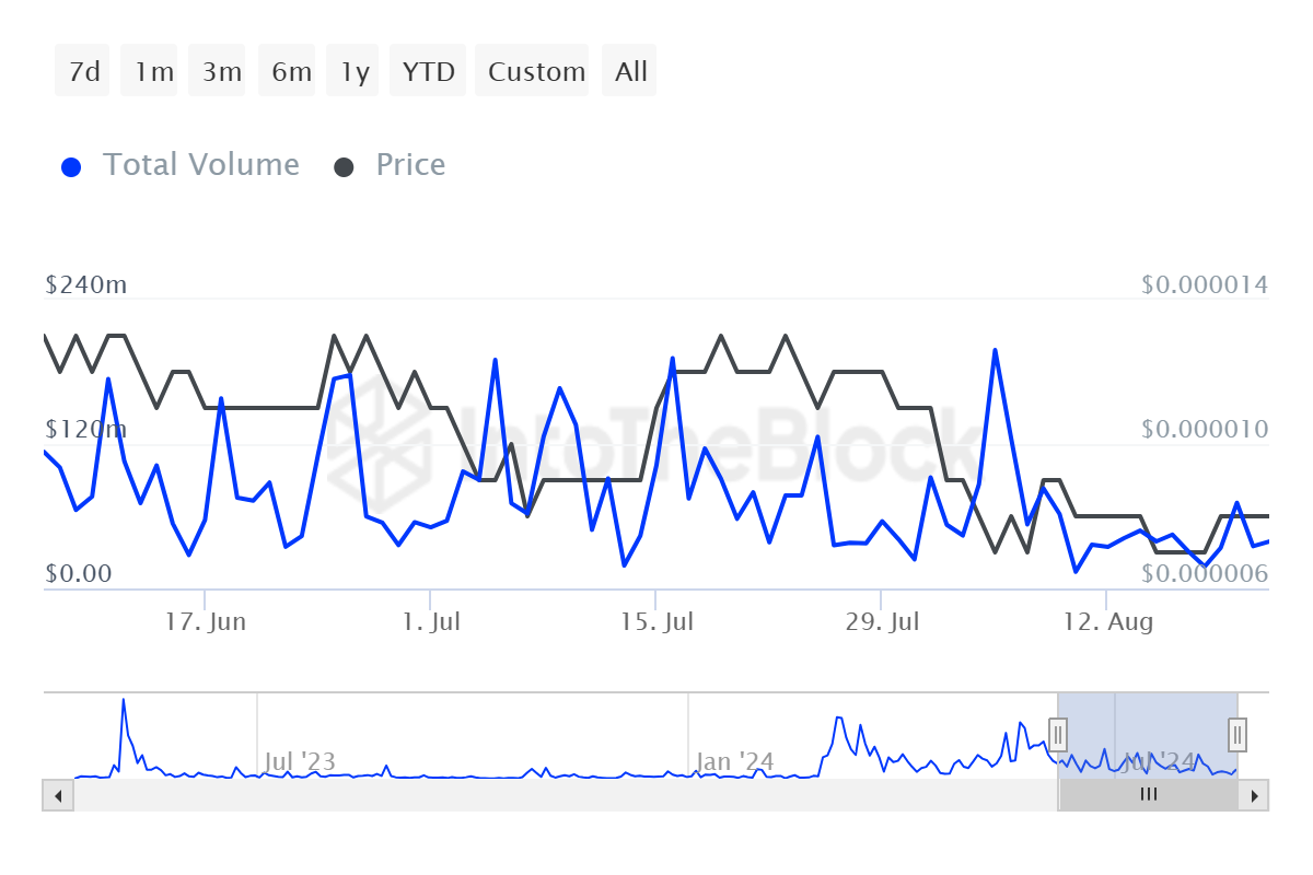 De afname in activiteit van whales wordt verder weerspiegeld in de significante daling van het gemiddelde dagelijkse handelsvolume van PEPE. In slechts één week tijd is het volume met 60% gedaald, van $83 miljoen naar $33 miljoen. Deze scherpe afname in handelsactiviteit kan leiden tot verhoogde koersvolatiliteit en het moeilijker maken voor PEPE om eventuele potentiële rally’s te ondersteunen.